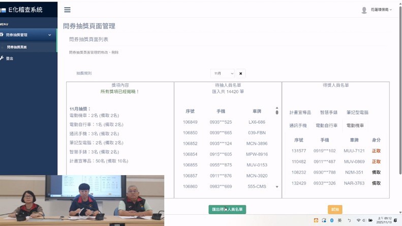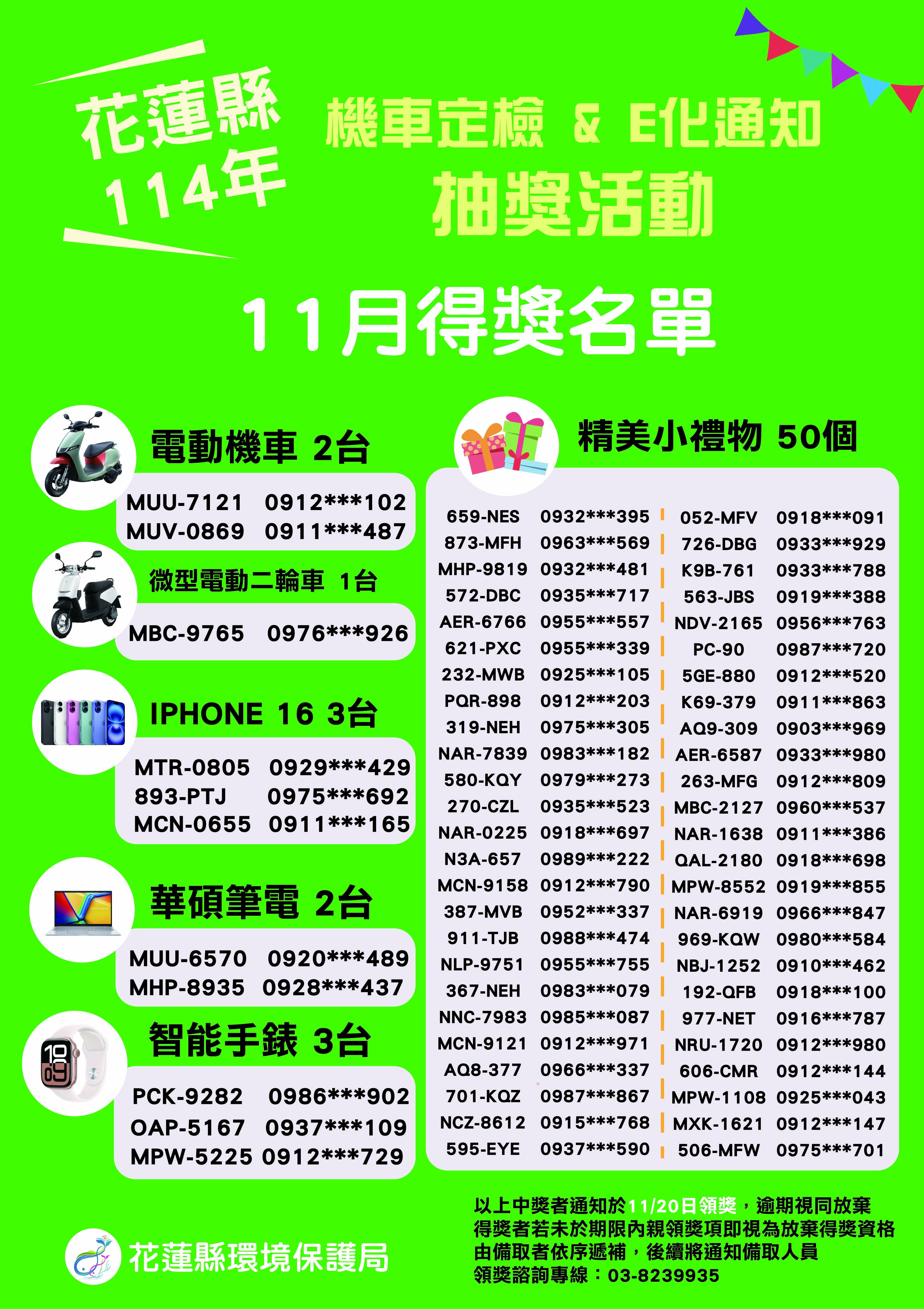 為推廣機車排氣定期檢驗簡訊通知服務、鼓勵民眾按期完成定檢,花蓮縣環境保護局辦理「114年度完成機車排氣定檢及簡訊通知登錄抽獎活動」,於114年11月13日上午9點辦理公開抽獎,由空氣噪音防制科科長林則劭親自擔任抽獎人,全程錄影並上傳至花蓮縣環保局Facebook粉絲專頁,歡迎民眾前往查閱。