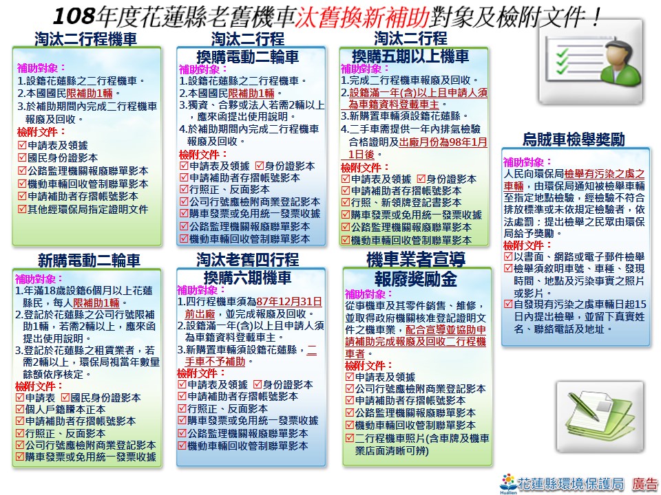自108年5月13日起,凡符合淘汰二行程或四行程機車車籍須設籍花蓮縣滿一年(含)以上且申請人須為車籍資料登載之車主。其中老舊四行程機車須為民國87年12月31日前出廠,車齡20年以上之四行程機車;5期以上機車為98年1月1日起生產之車輛,6期機車為106年1月1日起生產之車輛,皆可申請補助,歡迎來電03-8239935或03-8237575轉分機303 洽詢。