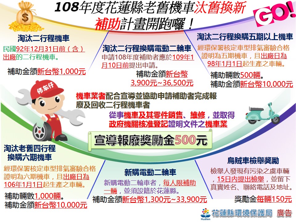 花蓮縣環境保護局饒忠局長表示,現行各項補助金額及補助換購電動二輪車對民眾吸引力相對有限,造成各縣市推廣效益不彰,除上述補助項方案,為吸引本縣老舊高污染車輛汰換,提出換購符合最新環保期別之車輛,故訂定「108年度花蓮縣環境保護局二行程機車汰舊及老舊四行程機車換購補助注意事項」,於108年5月8日起實施,分別對「淘汰二行程機車換購五期以上機車」及「淘汰老舊四行程機車換購六期機車」進行補助,補助輛數分別為500輛及1,000輛,每輛補助金額1萬元整,共計補助1,500輛,額滿為止,歡迎花蓮鄉親多加利用。