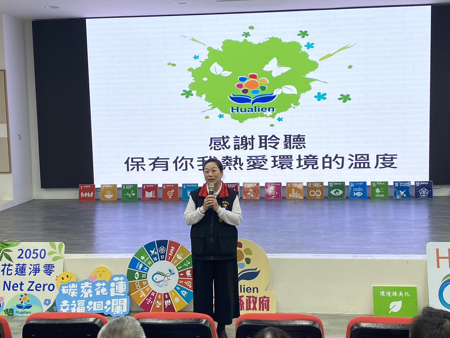花蓮縣長徐榛蔚非常重視此系列講座,特地到場勉勵參與人員,強調「永續是花蓮的日常」,謝謝各鄉鎮公所、村里長及志工們的努力,在日常生活中實踐低碳,致力減少碳排,並說明花蓮縣推動淨零碳排是領先全國,而台泥再生資源中心、璞石閣沼氣回收中心都是全國第一,顯示花蓮縣政府對淨零排放的用心和努力,更需要靠大家推動低碳永續家園。另外,花蓮縣政府還發展98條低碳旅遊路線,創造花蓮永續觀光旅遊業新契機,希望各位與會的村里社區未來能積極報名參與,一同創造花蓮2050淨零。