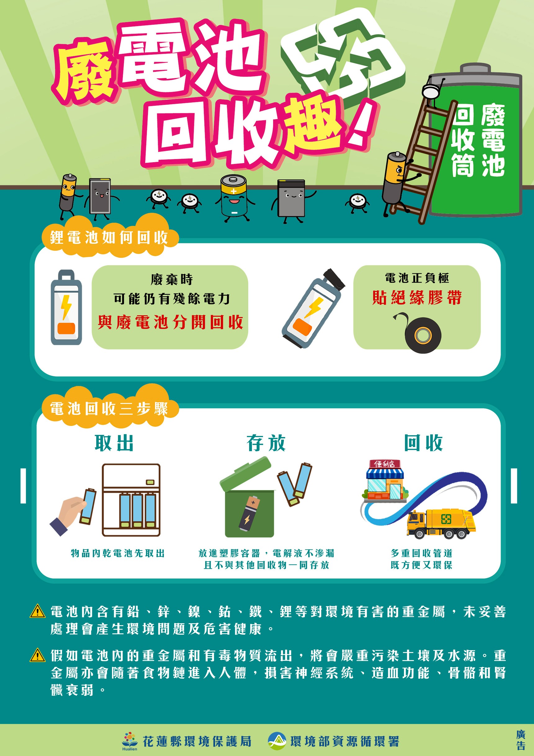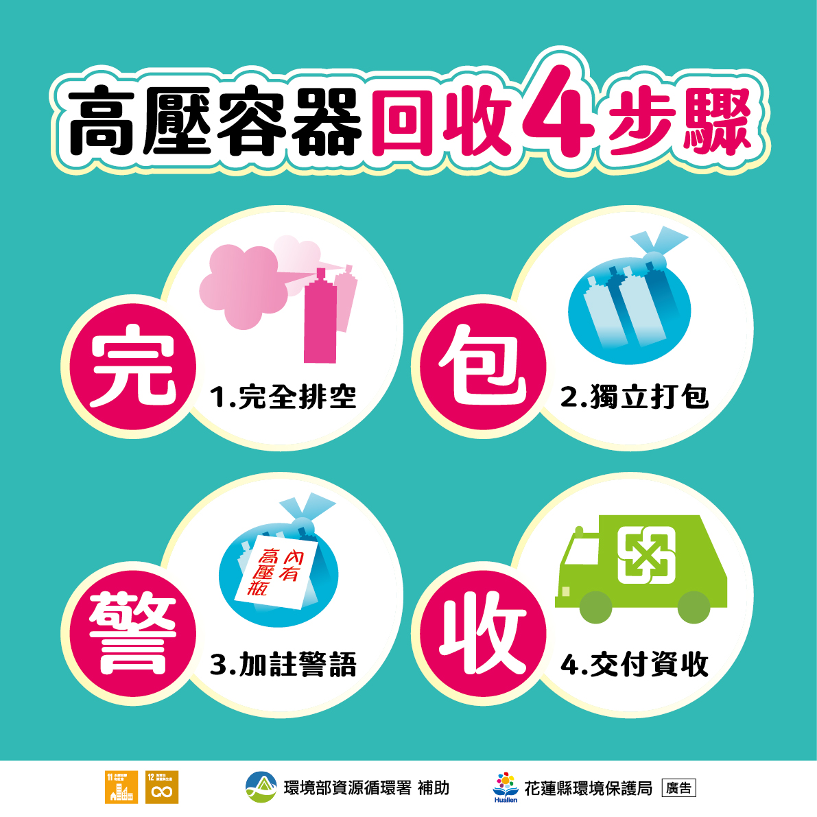 花蓮縣環保局提醒,民眾排放垃圾時,應先做好分類:一般垃圾妥善打包;資源回收物依規定分類交付;廚餘請瀝乾水分後回收。其中,含電池之物品如玩具、電子產品等,應先將電池取出,再分別交付資源回收車由清潔隊員回收;噴霧罐、瓦斯罐等物品,務必確認內容物已完全排空,並依各鄉鎮市公告方式回收,切勿直接丟入垃圾袋中。如對分類方式有疑問,可向環保局或各地清潔隊洽詢。