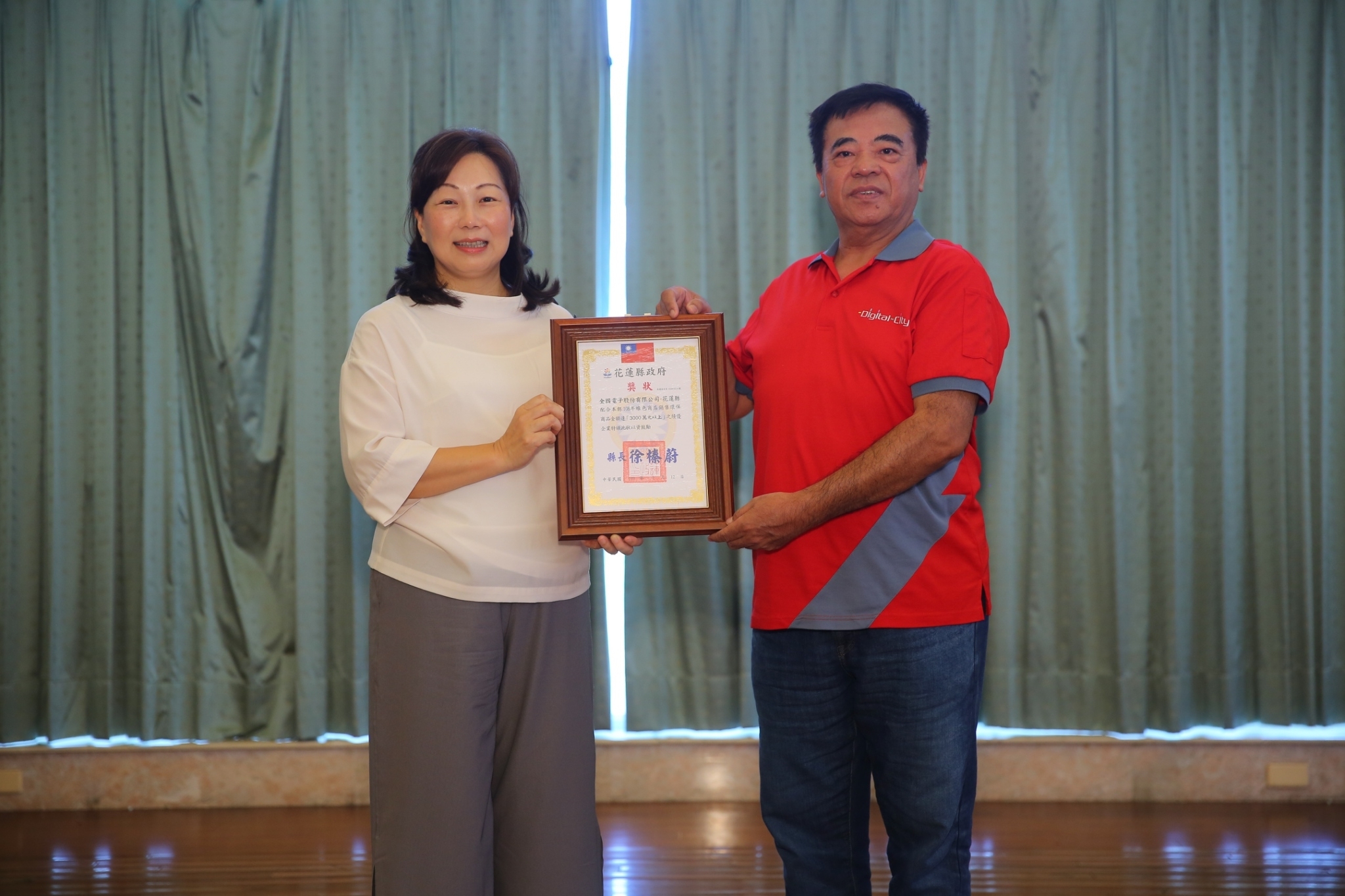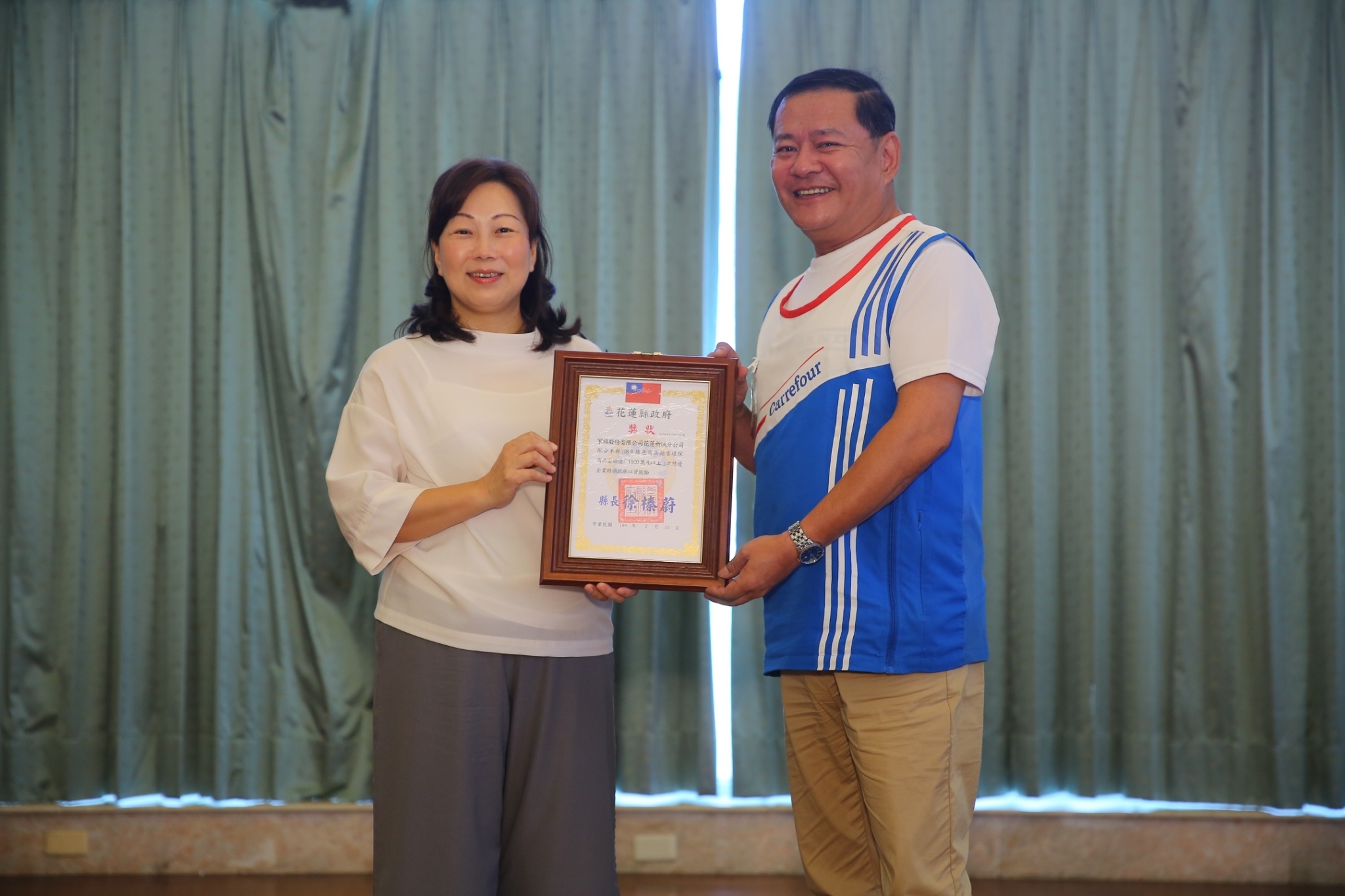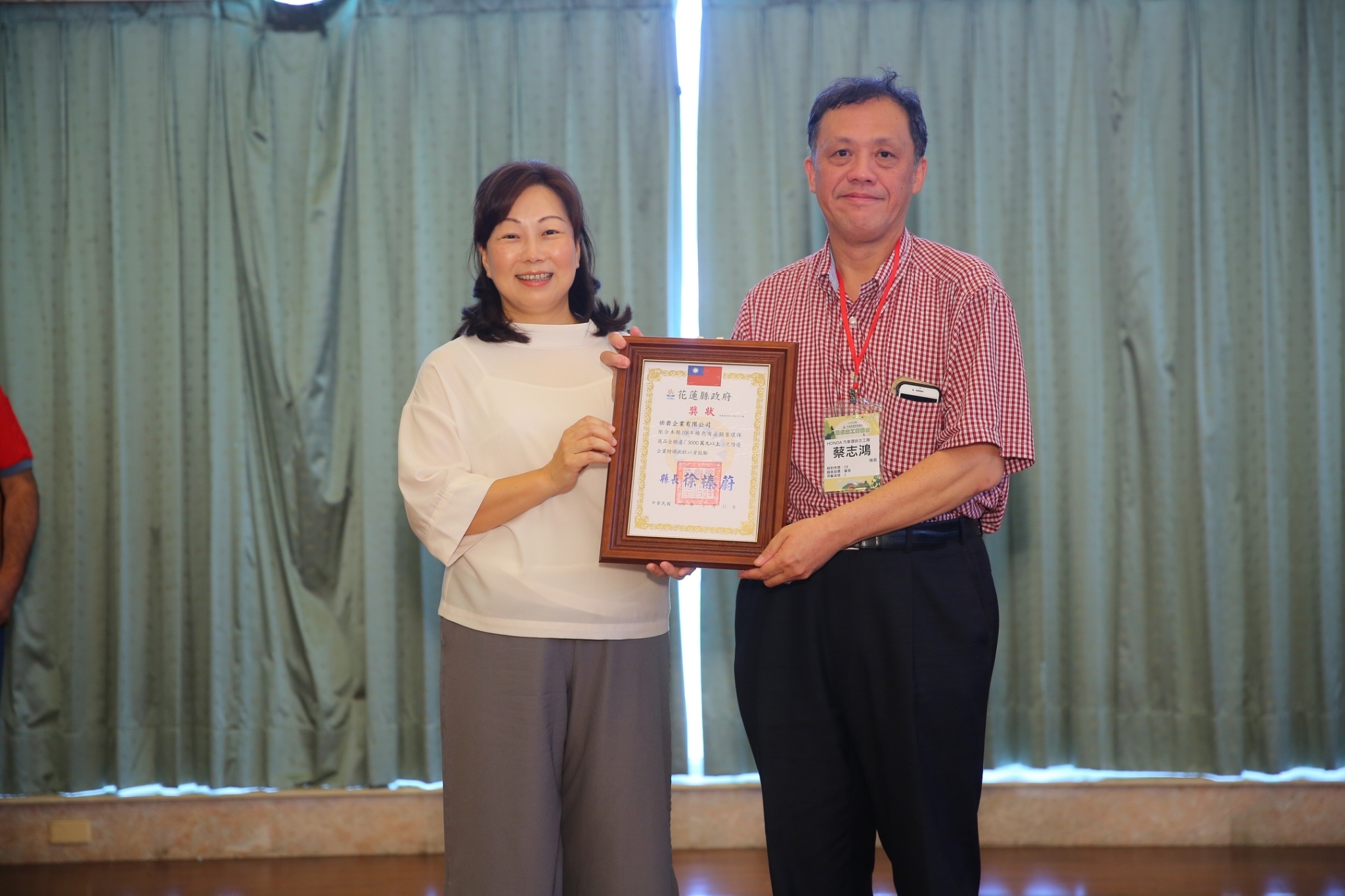花蓮縣為表揚108年推動「民間企業與團體實施綠色採購計畫」成效績優之企業,特頒贈獎狀以資鼓勵,其中有東部汽車股份有限公司、佑岩企業有限公司、全國電子股份有限公司花蓮縣、家福股份有限公司花蓮新城分公司、台灣富士全錄股份有限公司-花蓮分公司、台象股份有限公司-花蓮門、遠百企業股份有限公司-愛買量販店花蓮店、台灣電力股份有限公司花蓮區營業處、台灣水泥股份有限公司和平分公司、中華電信公司花蓮營運處以及臺灣菸酒股份有限公司花蓮營業處,特此感謝這11家績優企業對環境保護付出一份心力,並頒發獎狀以資鼓勵。