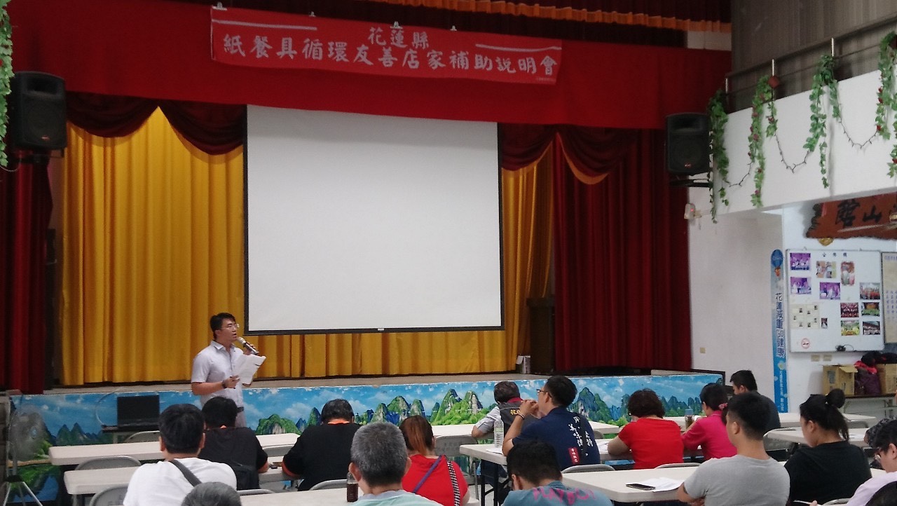 花蓮縣環保局已於6月底完成調查轄內符合補助資格之業者,並於7月31日下午兩點於花蓮市主農里活動中心舉辦紙餐具循環友善店家補助計畫說明會,會議中邀請北區自助餐、便當業者共計35家業者參與,會議中除針對本年度紙餐具補助原則、補助方式及成效追蹤進行說明外,另針對本年度全民運動會將辦理餐具借用方式進行說明。
